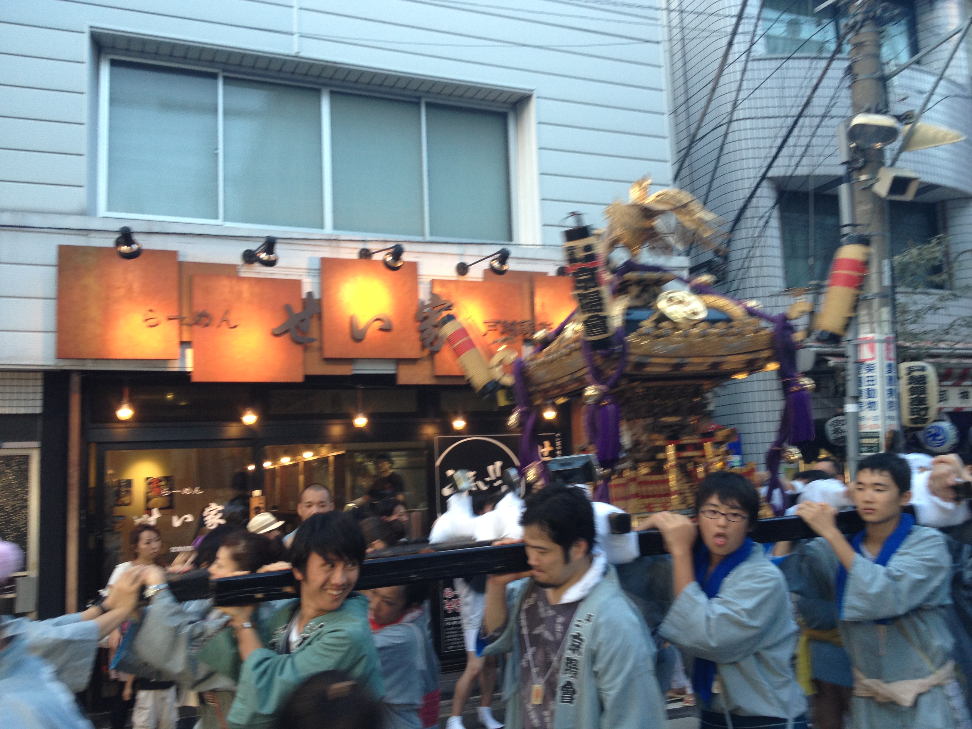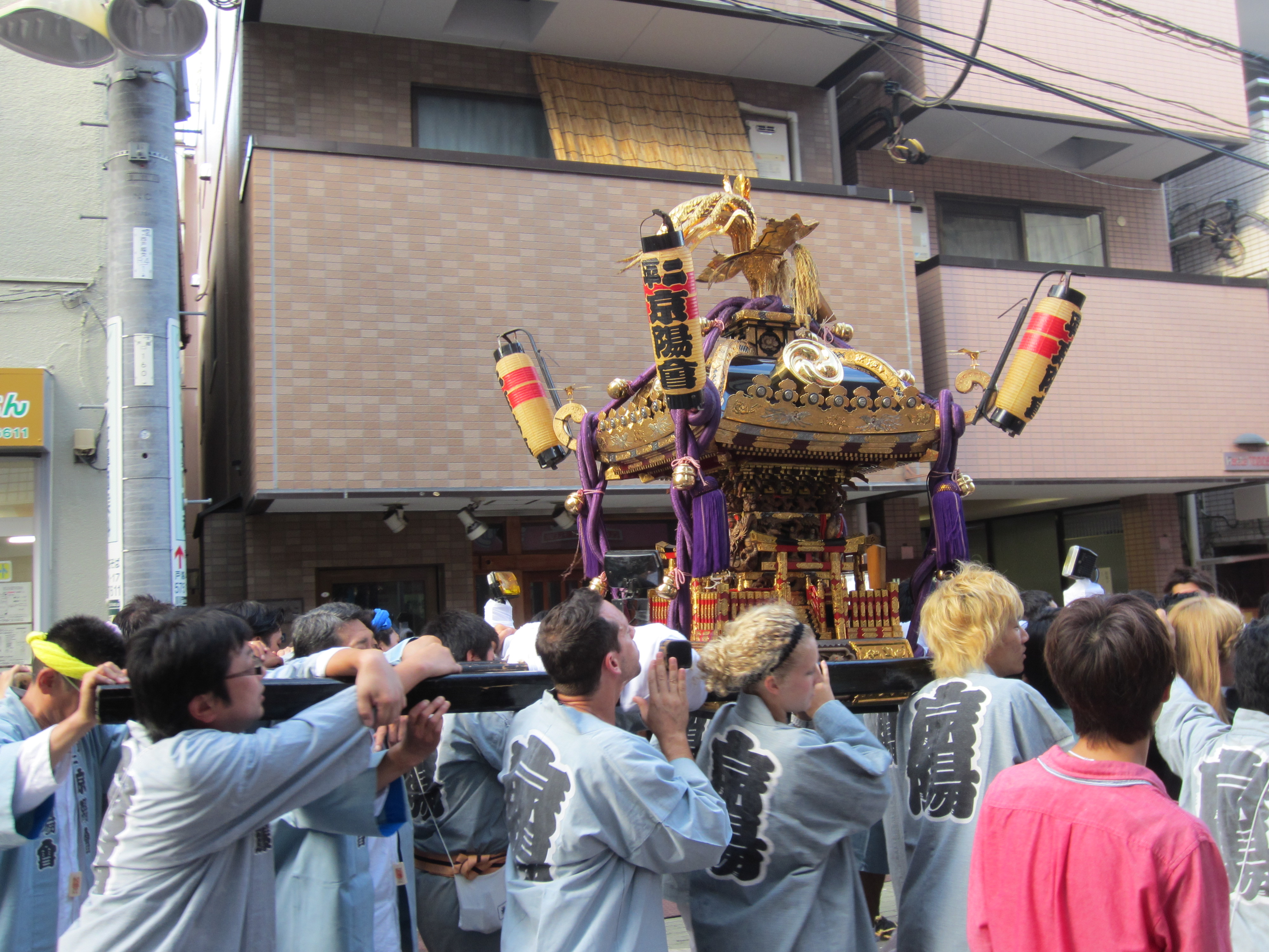 The weekend before I was invited to attend a Togoshi Hachiman Festival.  This is a street festival in which the neighborhood people carry a portable shrine through the streets to show their gratitude for their blessings; something that has been done since the Edo Period. It is an interesting tradition and one I do not quite understand, but I am glad I was able to experience it.  We walked with our “team” to the neighborhood’s actual shrine where it was blessed.  We then followed them back.  Those poor guys and gals were so hot and sweaty and the shrine was definitely not light.  One guy on the street watching with us told us his shoulders were bruised for weeks after he helped carry the shrine during a previous festival.  Check out the video.  The white guy and blonde girl are two teacher from ASIJ that volunteered to carry the shrine.  I’m glad I was in charge of video!